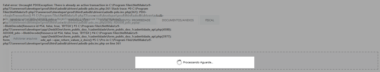 Estava funcionando normalmente até uns tempos atrás porém agora, quando clicamos no botão “Salvar” após ter selecionado pelo menos um arquivo, o ScriptCase gera um erro: PDOException: "There is already an active transaction in…" conforme ilustra a imagem em anexo “Erro.png”.