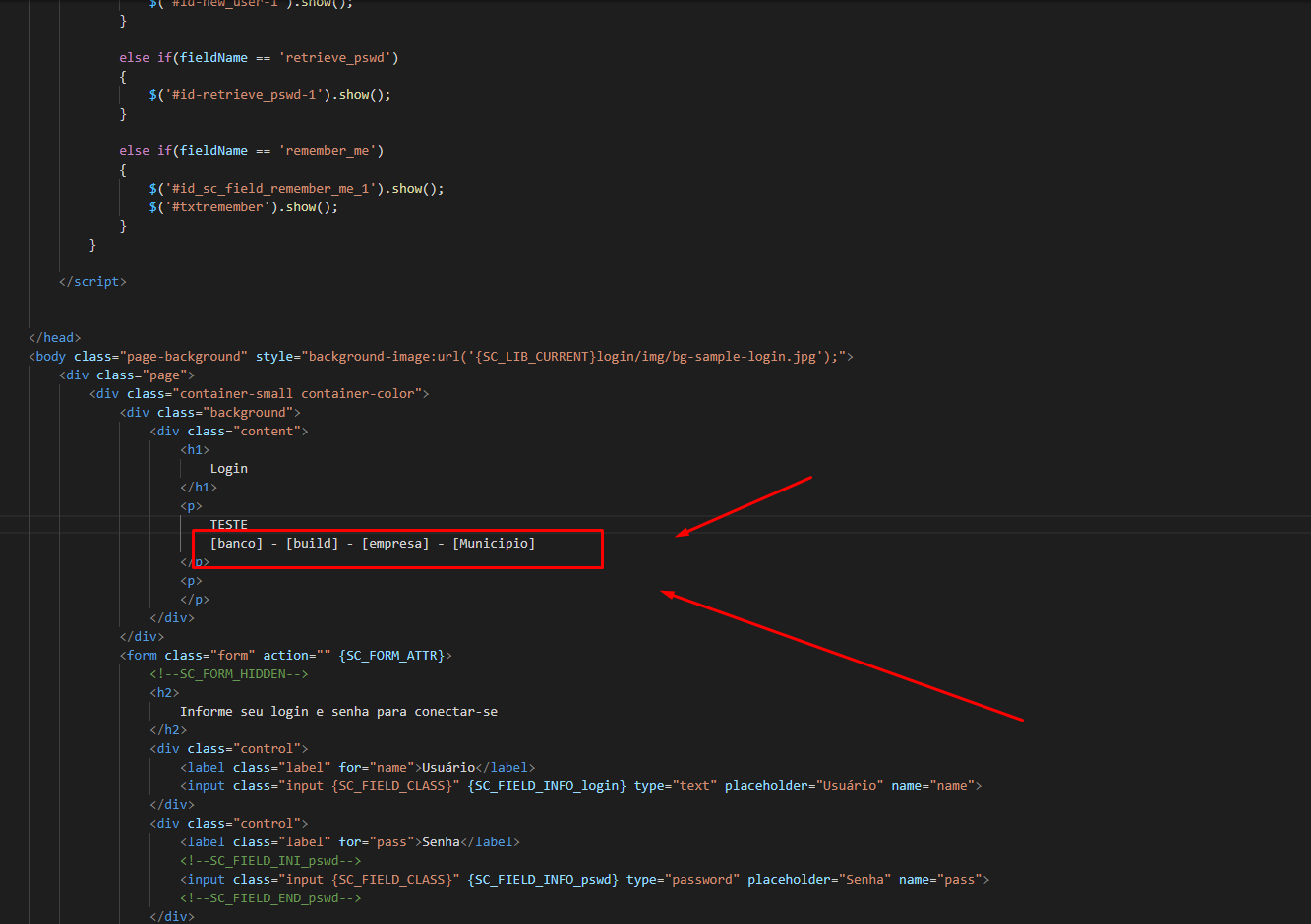 Boa tarde, estou alterando uma tela de Login de exemplo do próprio SC, porém eu queria colocar alguns valores que mudam. As variáveis da foto já possuem valores de informação do banco, versão, nome do cliente e cidade do cliente, porém não sei como aplica-los nessa pagina que é HTML, algum de vocês já verificou algo desse tipo ou teria alguma ideia de como poderia resolver?