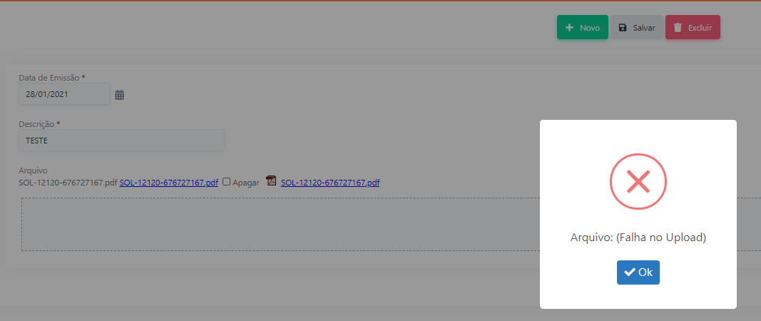Olá, alguém sabe como desconsiderar a exigência de upload do arquivo anexo no momento da edição? No print desejo apenas alterar a descrição e salvar, mas exige um arquivo para upload. Muito obrigado.